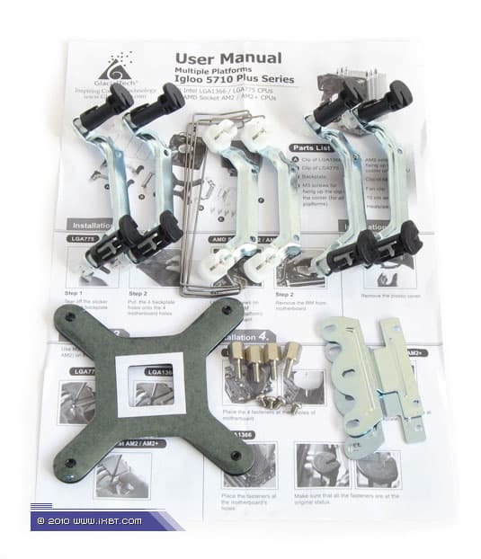 Эксплуатационная эргономика. Инсталляционный комплекс Igloo 5710 Plus вполне типичен для продуктов среднего класса — на платформе Intel LGA775 и AMD Socket AM2/AM3 радиатор фиксируется с помощью традиционного винтового крепежа, присущего еще родительским сериям Igloo 5610/5710 и Igloo 7610, а совместимость с новыми платформами Intel LGA1366 и LGA1156 обеспечивают комплектные скобки с референсными замками-кембриками. То есть, в установочных процедурах «новички» Igloo 5710 Plus почти что эквивалентны типовым боксовым кулерам (за вычетом далеко не самых трудоемких операций по монтажу крепежа и вентилятора непосредственно на радиаторе).