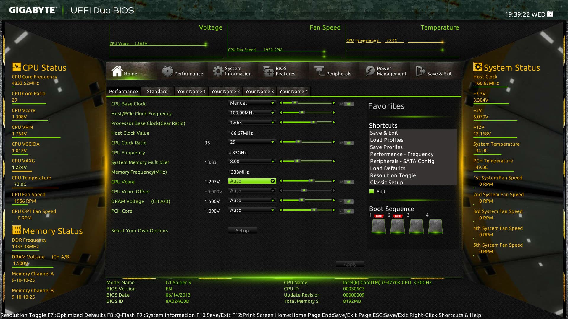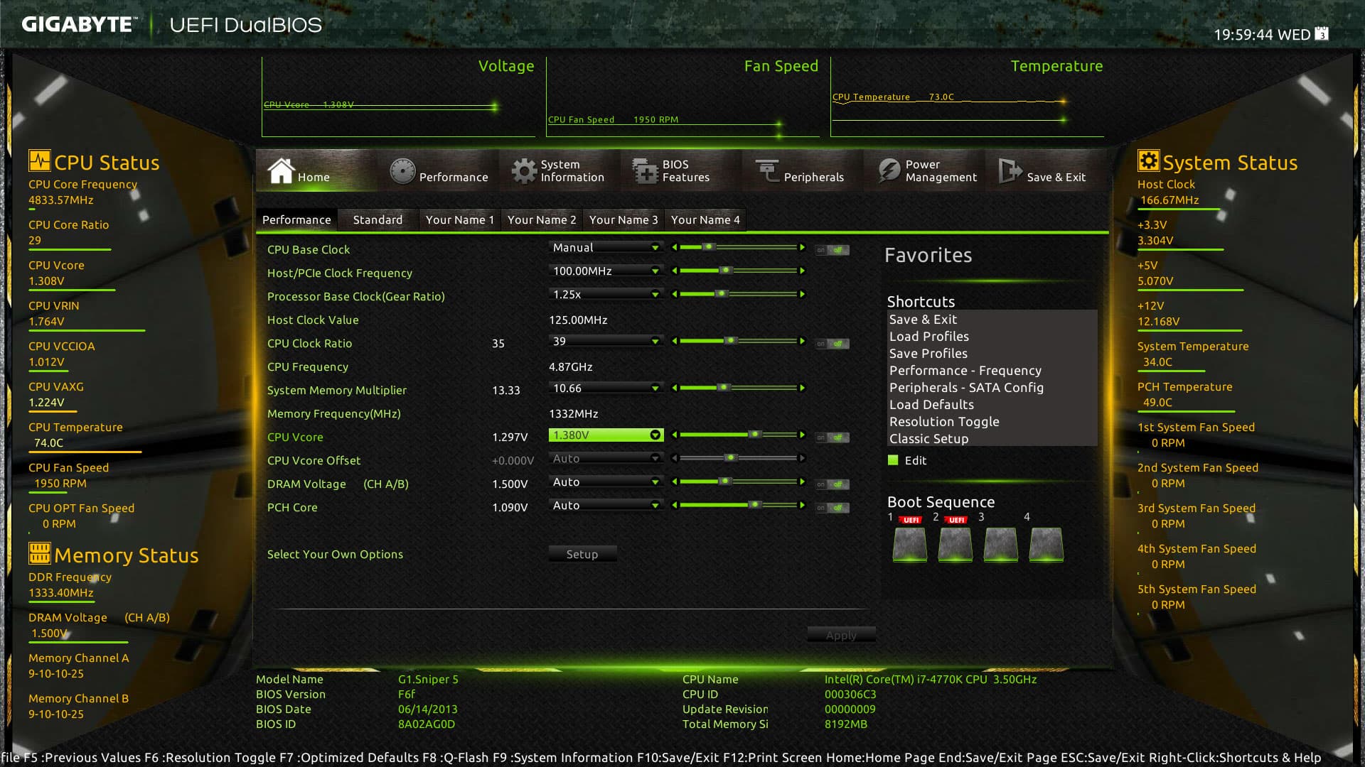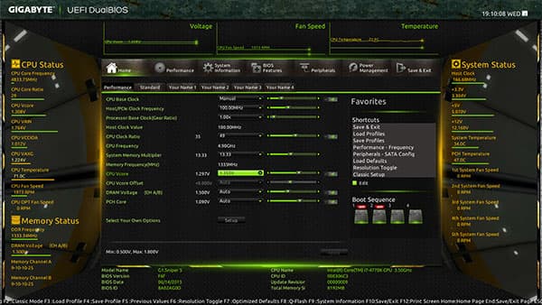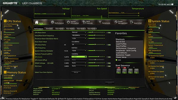 Единственный вариант в данном случае — это вручную понизить напряжение Vcore и попытаться увеличить частоту процессора. Снизив напряжение Vcore до значения 1,3 В, нам удалось добиться стабильной работы процессора на частоте 4,7 Гц. Для частоты 4,8 ГГц напряжения Vcore пришлось увеличить до значения 1,32 В, а для частоты 4,9 ГГц минимальное значение напряжения Vcore, при котором система загружалась, составило 1,355 В. При такой частоте в режиме загрузки процессора температура составляла порядка 98 °C и включался режим троттлинга. Кроме того, работа процессора была нестабильна и сопровождалась зависаниями системы. Одним словом, максимум, что нам удалось выжать из процессора Intel Core i7-4770K с воздушным охлаждением при опорной частоте 100 МГц — это 4,8 ГГц при стабильной работе в режиме загрузки процессора.