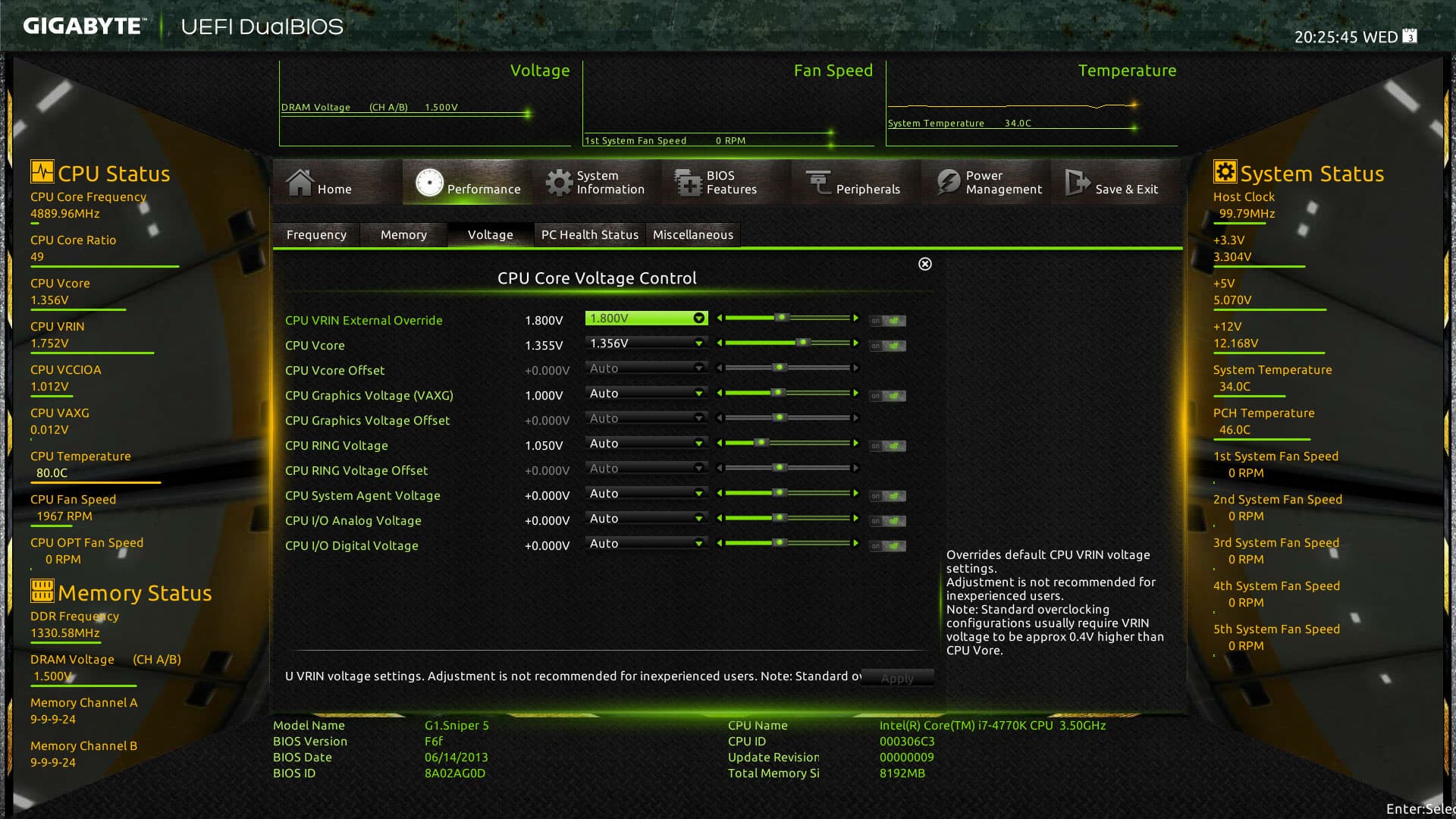 С учетом нового IVR в процессорах Haswell в большинстве случаев при разгоне (не экстремальном) ядер процессора корректировать необходимо только значение напряжения на ядрах процессора, которое называется CPU Vcore (встречаются также обозначения CPU Voltage, Core Voltage, Processor Voltage Override и другие). Для процессоров Haswell BIOS позволяет менять значение CPU Vcore с шагом 0,001 В до максимального значения 1,8 В.