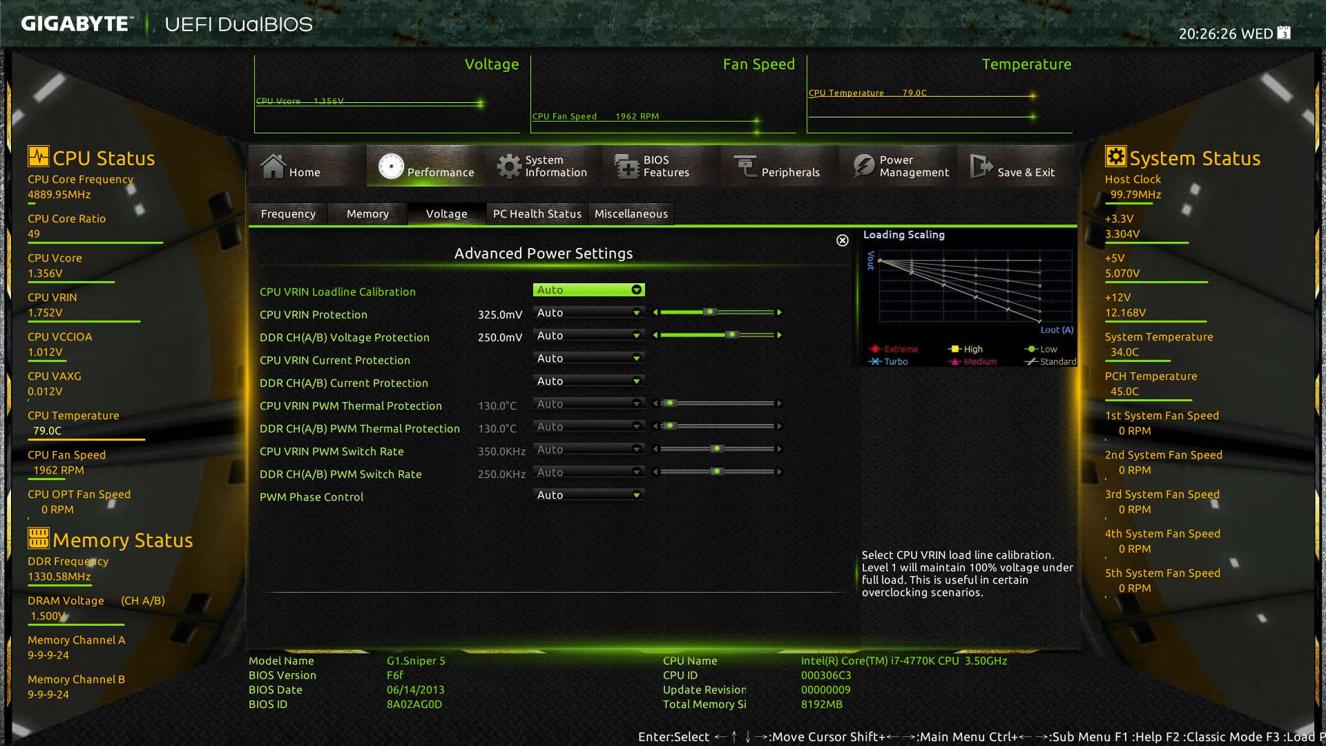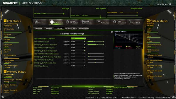 Отметим, что если в процессорах Sandy Bridge и Ivy Bridge при разгоне иногда возникала необходимость корректировать проседание напряжения под нагрузкой, то в процессорах Haswell, за счет интегрированного регулятора напряжения питания, значение проседания напряжения мало даже при высоких нагрузках. Тем не менее, на некоторых (но далеко не на всех) платах под процессоры Haswell предусмотрена возможность компенсации падения напряжения при загрузке процессора. Эта технология называется Load Line Calibration (LLC), то есть компенсация нагрузочной кривой. Иногда встречаются и другие обозначения, например Processor VR Droop Control. На разных платах предусмотрены различные опции для функции LLC. Это могут быть уровни компенсации (к примеру, может быть пять уровней), LLC может выражаться в процентах, а могут быть и такие малопонятные значения, как High V-droop (Power Saving), Mid V-droop и Low V-droop (Performance).