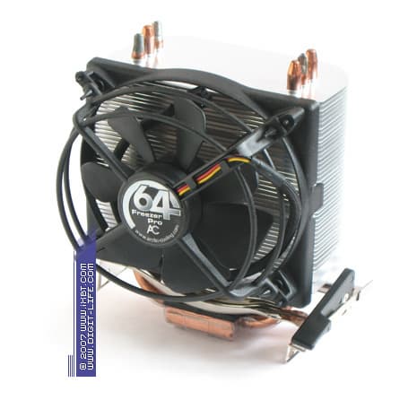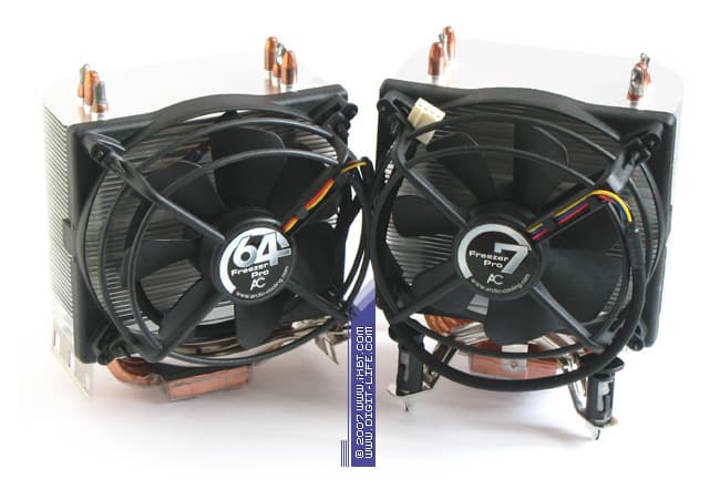 Открывают сегодняшнее обозрение «середняки» из продуктовой линейки Arctic Cooling — Freezer 7 Pro и Freezer 64 Pro. Оба кулера располагают одинаковым техническим конструктивом (это комбинация медного теплосъемника 32х33х10 мм, 3 медных тепловых трубок диаметра 6 мм и секции алюминиевого оребрения, набранного из 42 закругленных пластин с эффективными размерами 105х56 мм) и внешне различаются только лишь крепежом: Freezer 7 Pro ориентирован на платформу Intel LGA775 (укомплектован стандартными замками-кебриками), а Freezer 64 Pro адаптирован уже под системы AMD (снабжен шестиконтактной клипсой с поворотной ручкой-рычагом). Дополнительная дифференциация сокрыта в номинальной скорости вращения крыльчатки вентилятора, которая у Freezer 7 Pro и Freezer 64 Pro составляет соответственно 2600 и 2200 об/мин.