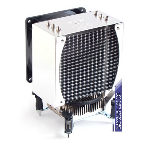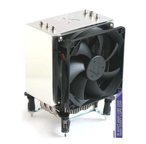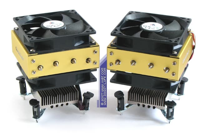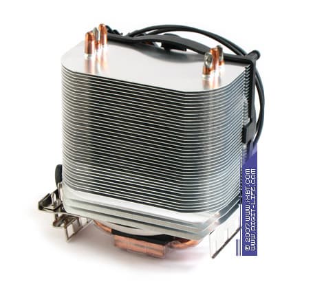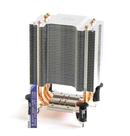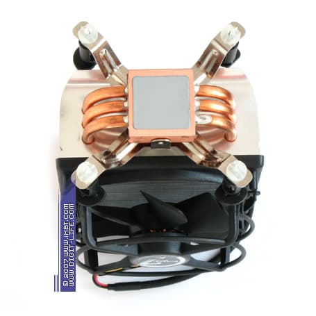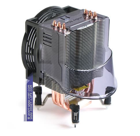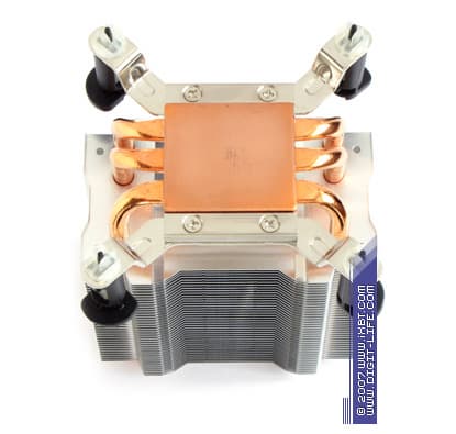 В остальном имеем технический портрет, почти что идентичный Igloo 5600 — хорошо продуваемое компактное оребрение с развитой поверхностью теплообмена (порядка 2800 см²), рациональный и действенный вспомогательный радиатор (который сам по себе довольно-таки технологичен), добротное сопряжение компонентов «рабочего тела» (теплосъемника, трубок, вспомогательного радиатора, оребрения) и надежные винтовые крепления.