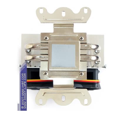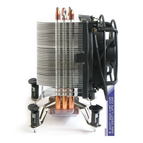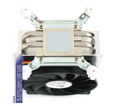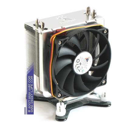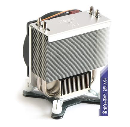 То есть, вновь наблюдаем замещение набортного вентилятора более производительным вариантом, того же самого типоразмера, 92х92х25 мм, но с улучшенным аэродинамическим оформлением крыльчатки и более строгим комбинированным подшипником (подшипник скольжения плюс подшипник качения), и отмечаем повторную реинкарнацию вспомогательного радиатора в опрятные габариты 55х50х18 мм. Все это позволяет улучшить эргономичность «рабочего тела» Igloo 5710 — сбросить вес ниже психологически важной отметки 500 г и снабдить кулер стандартизованным крепежом под LGA775 (на замках-кембриках), сберегая и даже в чем-то преумножая солидные функциональные характеристики «предка» — Igloo 5700 MC.
