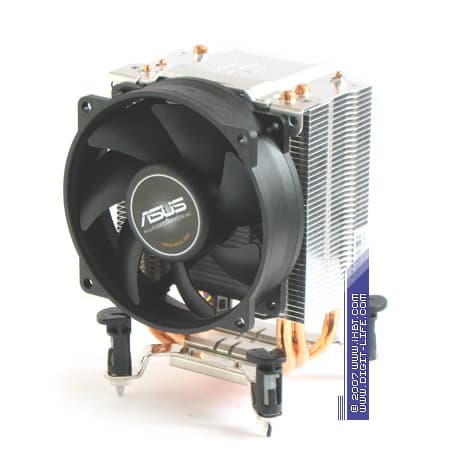 Продолжает сегодняшний тест-лист представитель модельной линейки ASUS — «середнячок» Triton 70. Этот кулер опирается на вполне благопристойный технический конструктив (имеем медный теплосъемник 38х35х2 мм, 3 тепловых трубки диаметра 6 мм, алюминиевое оребрение в наборе из 40 пластин с эффективными размерами 90х50 мм) и дополнительно укомплектован мультплатформенным крепежом (две скобки с референсными замками-кебриками под LGA775, плюс «безотверточная» клипса с поворотным рычажком под Socket AM2).