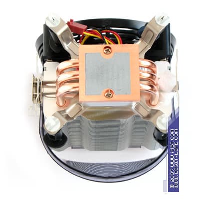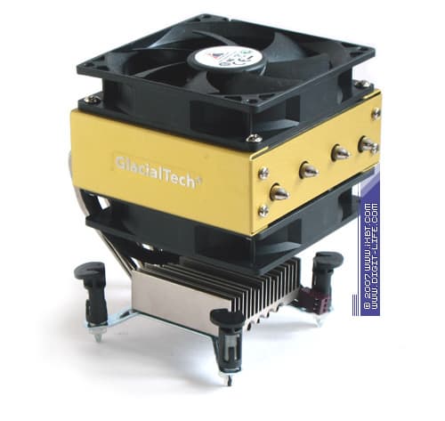 Главной достопримечательностью Igloo 5750 является продвинутый и по-своему уникальный технический конструктив: в принципе, собственно само «рабочее тело» тут вполне типично — оно составлено комбинацией медного теплосъемника 33х33х5 мм, 4 тепловых трубок диаметра 6 мм, вспомогательного радиатора 55х50х18 мм и секции алюминиевого оребрения (53 пластины 95х30 мм), развернутой в горизонтальной плоскости, но одна «мелкая» деталь — добавочный «нижний» вентилятор, примонтированный к оребрению, радикально меняет общий функциональный имидж кулера.