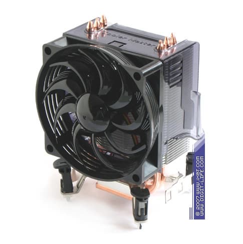Далее в нашем списке фигурирует «середняк» из модельного семейства Cooler Master — Hyper TX2. По факту этот кулер является наследником известного крепыша Hyper TX — он базируется на таком же развитом техническом конструктиве (медный теплосъемник 40х40х4 мм, 3 медных тепловых трубки диаметра 6 мм, алюминиевое оребрение в составе 41 пластины с эффективными размерами 90х45 мм), но, в отличие от двух родительских версий, совместимых только с одной из систем — Intel или AMD, снабжен мультплатформенным крепежом (скобки с замками-кембриками под LGA775 уже изначально смонтированы на подошве, там же зафиксирована разборная клипса под Socket AM2).