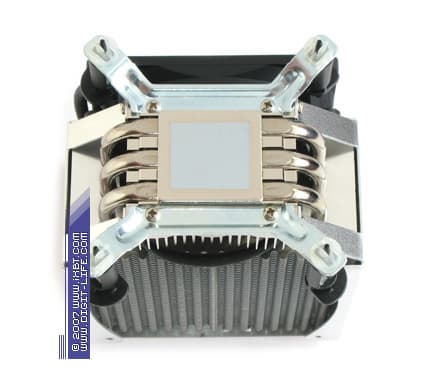 Весьма любопытно тут и техническое решение спецов Arctic Cooling, направленное на обеспечение дополнительного охлаждения околосокетных компонентов — не мудрствуя лукаво, они просто взяли и слегка подзагнули три нижних пластины оребрения, переориентировав небольшую часть воздушного потока в область сокета (согласно нашим исследованиям, трюк этот вполне действенный — некоторое улучшение теплового режима околосокетных компонентов имеет место быть!).