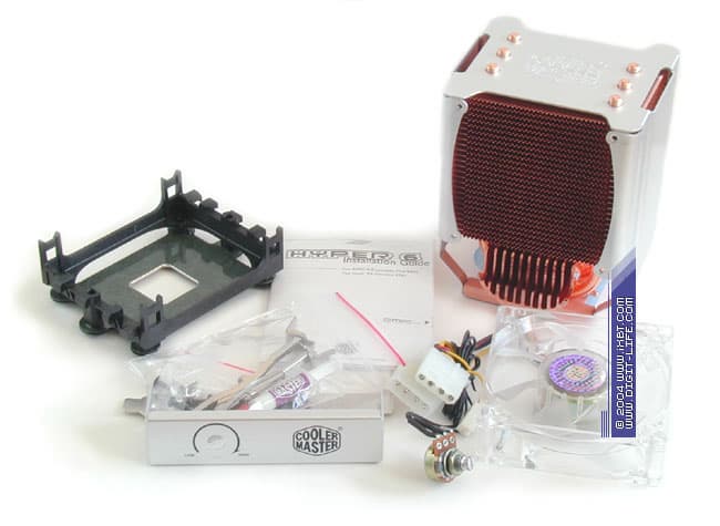 Хорошее впечатление оставляет не только радиатор, но и комплектация кулера: Hyper 6 располагает полным джентльменским набором, который включает добротный вентилятор типоразмера 80х80х25 мм (модель Protechnic MGT8012HS-T25), приправленный регулятором-потенциометром (скорость вращения крыльчатки может варьироваться в пределах от 2000 до 3000 об/мин), две планки для монтажа потенциометра на задней панели или в отсек 3.5" лицевой панели корпуса, набор мультиплатформенного крепежа (Socket 478, Socket 754), термопасту и техническое руководство.