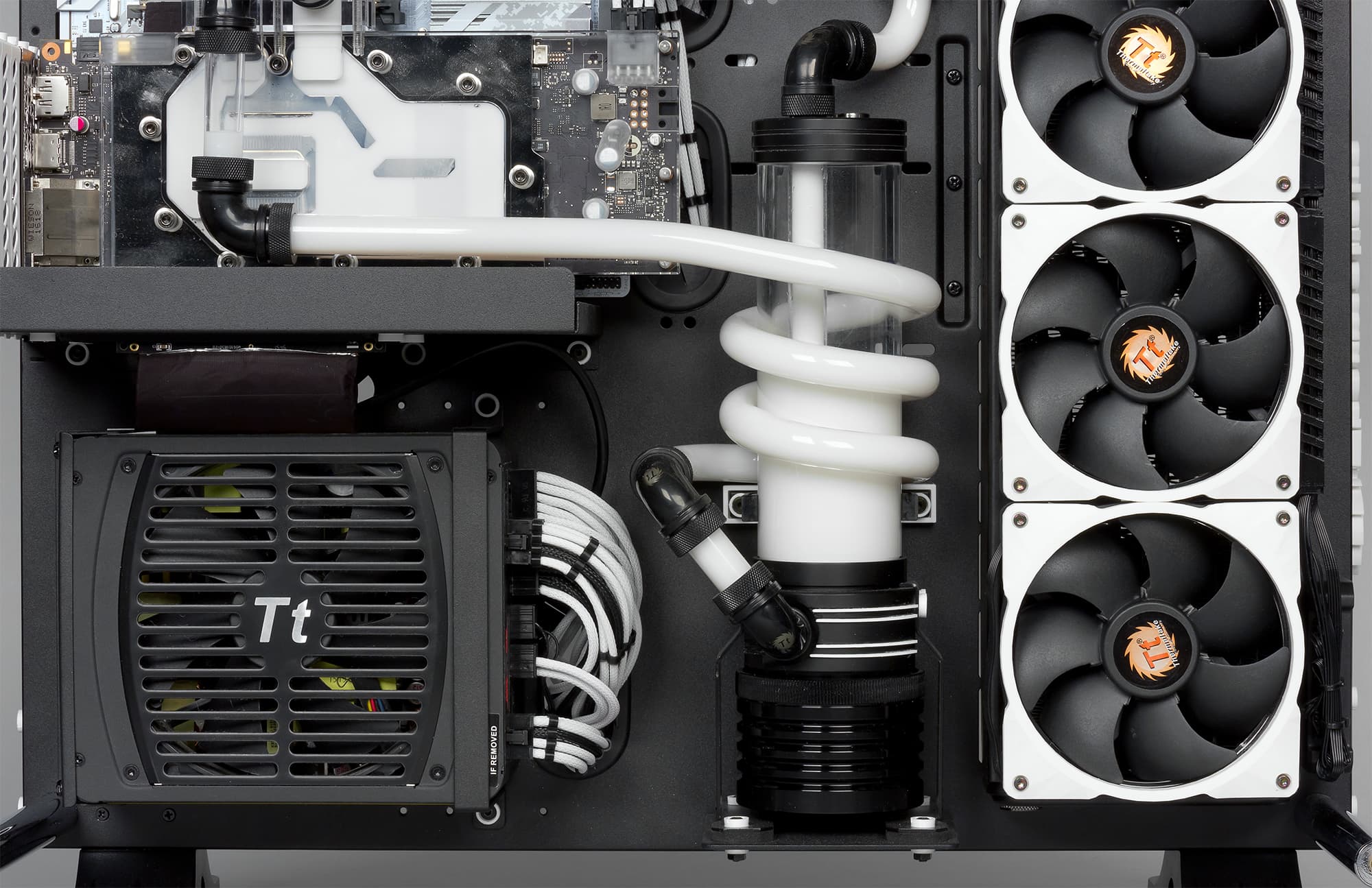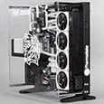 Доминирующими в дизайне этого компьютера являются два цвета: черный и белый. Сам корпус Thermaltake Core P5 претерпел, конечно же, моддинговые изменения: на стекле появились сделанные вручную наклейки, а на переднем торце корпуса — трехмерная надпись Thermaltake. Но это далеко не всё. В корпусе используется очень много деталей, которые специально изготовлялись для данного проекта.