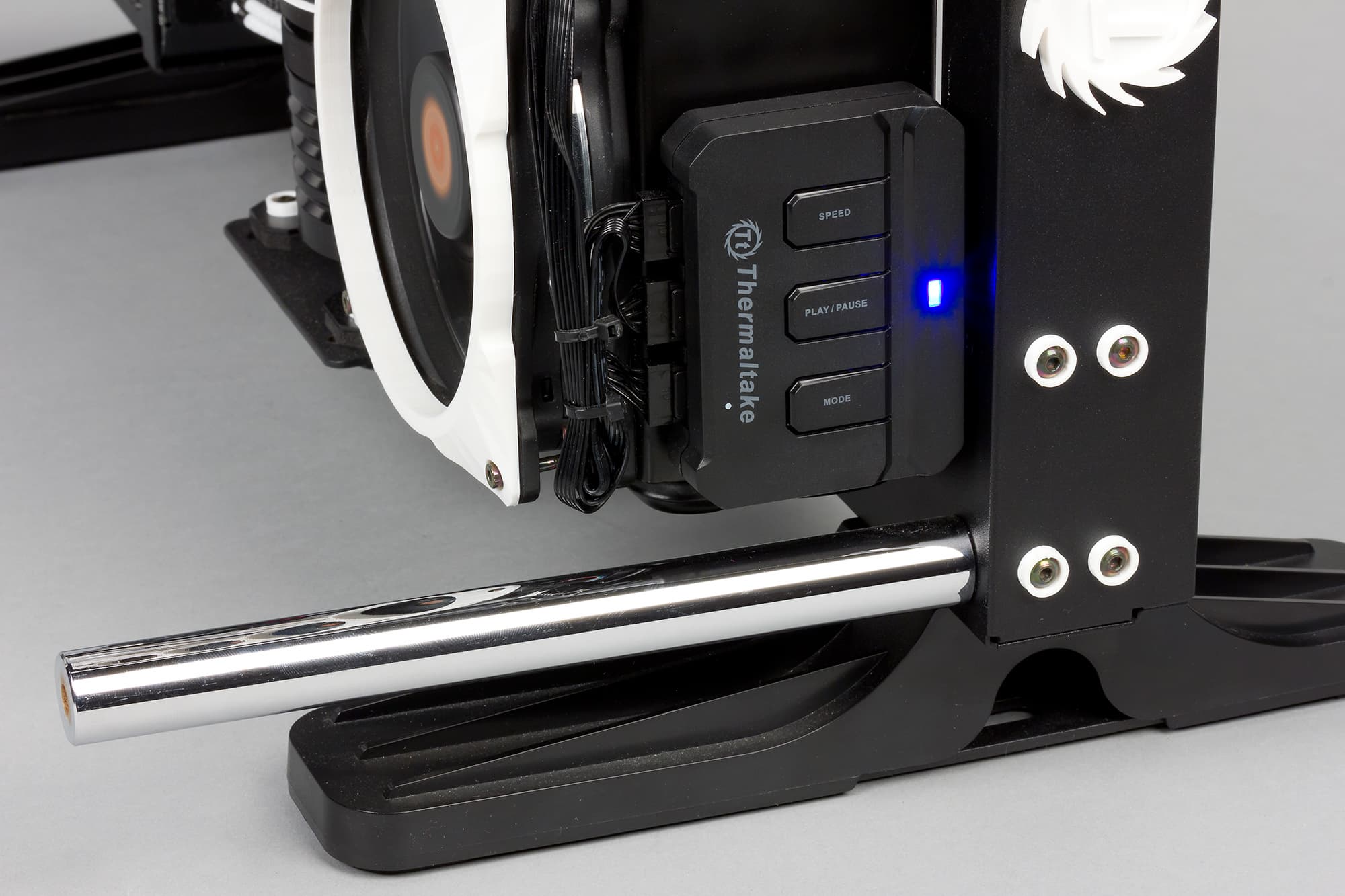 RGB-вентиляторы, закрепленные на радиаторе, тоже не совсем обычные. Это 120-миллиметровые вентиляторы Thermaltake, однако компания Thermaltake предлагает либо комплект из одного RGB-вентилятора с блоком управления, либо комплект из трех вентиляторов с единым блоком управления. Блоки управления рассчитаны максимум на три вентилятора, а в компьютере компании HWLab.pro на 480-миллиметровом радиаторе установлено четыре RGB-вентилятора с одним блоком управления. То есть стандартный блок управления в данном случае модернизирован и переделан под четыре вентилятора.