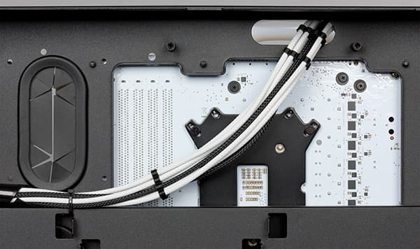Есть в дизайне рассматриваемого компьютера и различные декоративные элементы. К примеру, черная помпа украшена белыми пластиковыми ободками. Для всех винтиков, с помощью которых крепятся материнская плата, блок питания, заглушки в корзине для установки плат расширения, используются специальные пластиковые шайбы белого цвета. Кстати, эти заглушки также заменены с черных на белые.