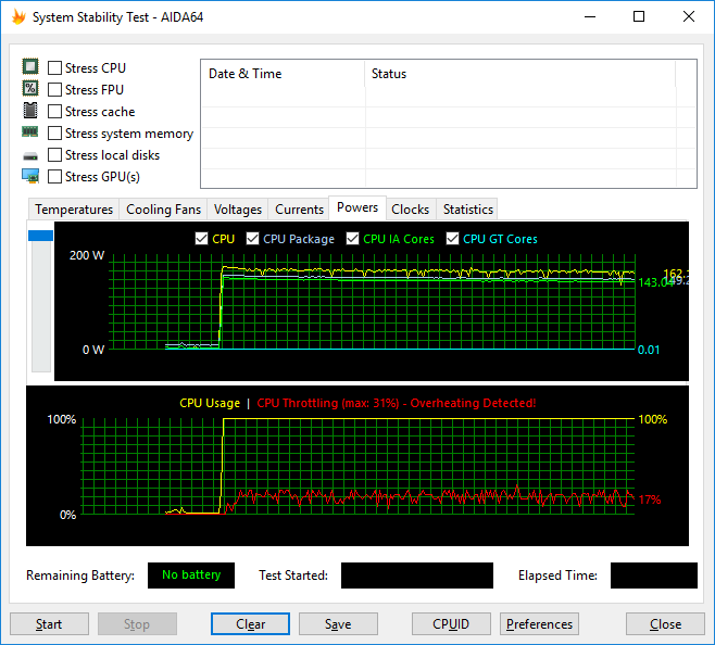 Температура ядер процессора достигает критического значения, а мощность энергопотребления процессора составляет 162 Вт.