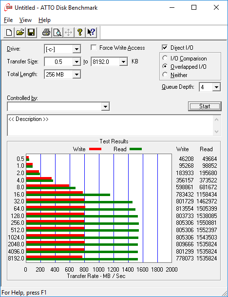 Буквально несколько слов о производительности системного накопителя SSD Kingston SHPM2280P2/240G. По данным утилиты ATTO Disk Benchmark, максимальная скорость последовательного чтения составляет 1500 МБ/с, а последовательной записи — 800 МБ/с.