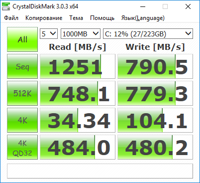 Утилита CrystalDiskMark выдает по максимальным скоростям последовательного чтения и записи примерно такой же результат, как и утилита AS SSD.