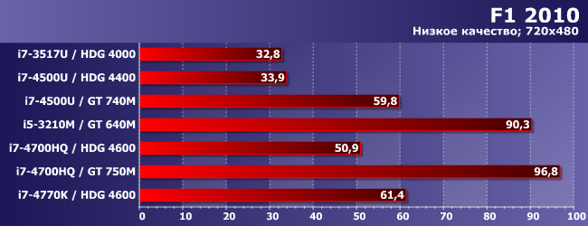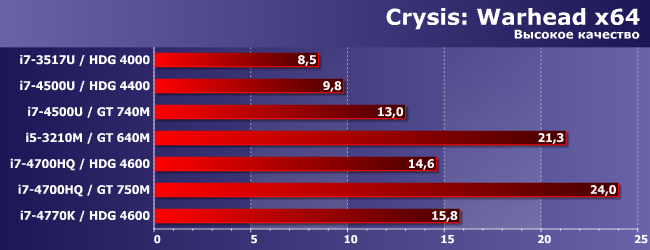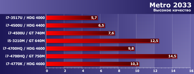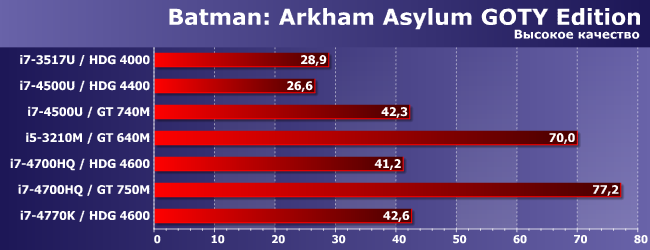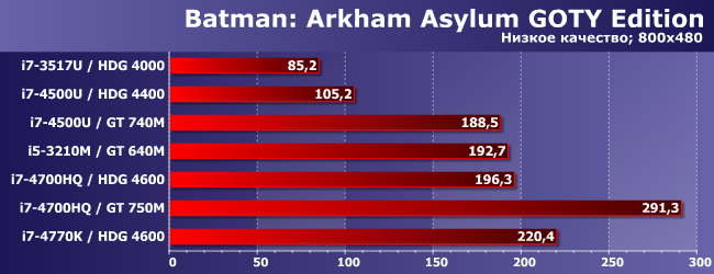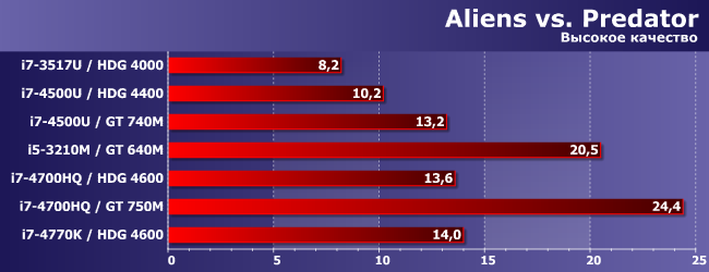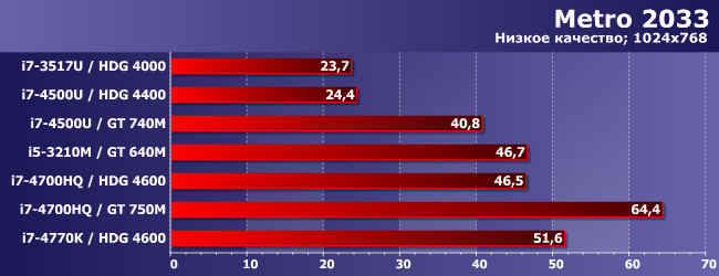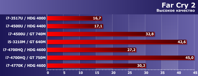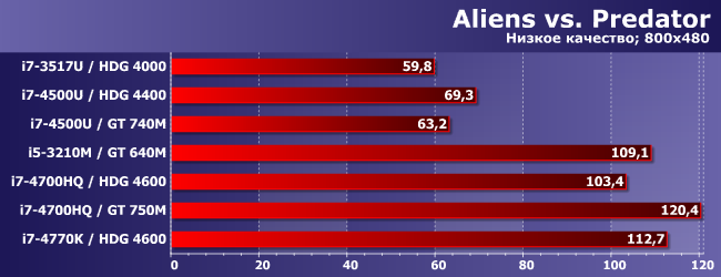 HDG 4600 может хоть как-то перевалить за 30 FPS только в паре с топовым процессором (умение утилизовать ресурсы CPU-части этим движком заставляет краснеть и разработчиков многих более современных проектов), а вот GT 740M это смог сделать даже в паре с Core i7-4500U — поскольку и сам быстрее, и с последнего «удавку» снял. Весьма показательно! Но не принципиально: как видим, лучше уж (и намного) GT 640M в паре с «нормальным» ноутбучным процессором.