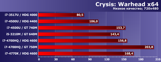 Кроме того, сегодня нам удалось пополнить и знания о HD Graphics. Во-первых, протестировали 4600 не только в топовом окружении. Стоит заметить, что результаты оказались даже чуть лучше, чем мы ожидали: разница между 4700HQ и 4770K примерно такая же, как между 3770S и 3770K, несмотря на то что процессоры в первой паре отличаются друг от друга сильнее. Во-вторых, сегодня мы познакомились и с HDG 4400, который произвел в целом положительное впечатление — как и можно было предполагать по названию, это решение быстрее, чем 4000, примерно на 10%. C глобальной же точки зрения можно поприветствовать решение Intel разделить линейку по частотам: в третьем или втором поколении 4200, 4400 и 4600 назывались бы одинаково, что способно ввести в заблуждение.
