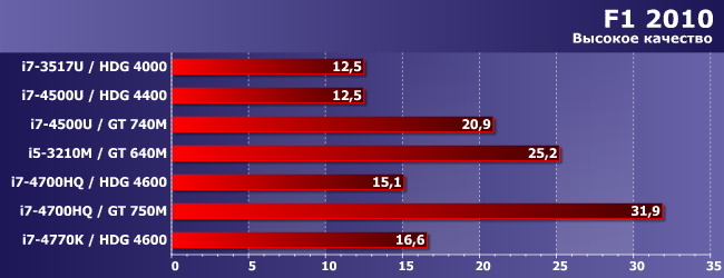 Через пару лет использования этого теста он, наконец-то, начал работать «честно» и на части интегрированных решений Intel. Правда, настолько медленно, что радость от этого кроме тестеров испытывать некому :) GT 750M же в паре с «хорошим» процессором позволяет играть в эту уже не новую версию кольцевых гонок в «уже не новом» разрешении 1680×1050 и с хорошим качеством картинки в целом.