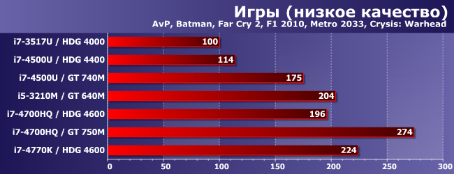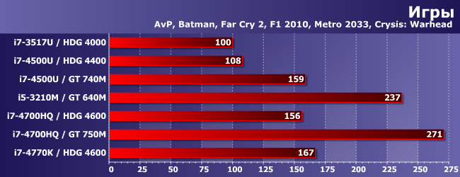 Жаль, что нам пока не удалось познакомиться со старшими модификациями IGP Intel. HDG 4600 к таковым не относится: он по-прежнему заметно медленнее, нежели мало-мальски пристойные GPU — как видим, GT 750M раза так в полтора быстрее. С другой стороны, доказать бесполезность дискретного видео в ноутбуках тоже легко: главное правильно подобрать тестовые конфигурации ;) Стоит только протестировать какой-нибудь GT 740M (есть подозрения, что в таких условиях и 750М и более быстрые решения окажутся не сильно лучше) в паре с низкопотребляющим процессором и… выясняется, что такой уровень производительности достижим и при использовании интегрированной графики. Что, безусловно, говорит не о бесполезности собственно дискретки, а о бессмысленности таких конфигураций. Причем бессмысленности полной: рекомендованная розничная цена 4500U выше, чем у 4700HQ. Разумеется, в первую очередь это связано с принципиально разным позиционированием продуктов — низкое энергопотребление стоит денег. А здесь оно существенно более низкое: 15 Вт против порядка 50 (с чипсетом). Но ведь и GT 740M (равно как и чипы памяти) питается далеко не святым духом, да и денег стоит. В итоге то на то и выходит. При этом, как видим, и в играх такая связка не выигрывает у одиночного 4700HQ, а во всех остальных приложениях однозначно ему проиграет. В общем, если хочется чего-нибудь недорогого двухъядерного, но с дискреткой, имеет смысл подождать осени, когда в продаже должны появиться новые ноутбуки на Core i3/i5 серии «М». Или не ждать, если есть в продаже подходящая модель прошлогодней коллекции: как видим, «ивиковый» 3210М с GT 640M — это не современно, но вполне адекватно.