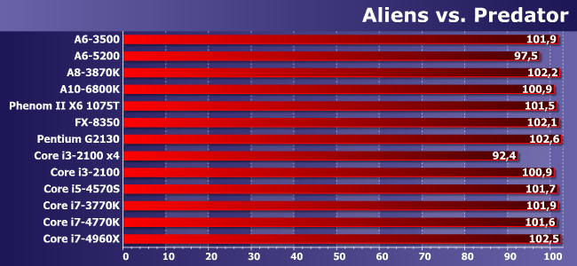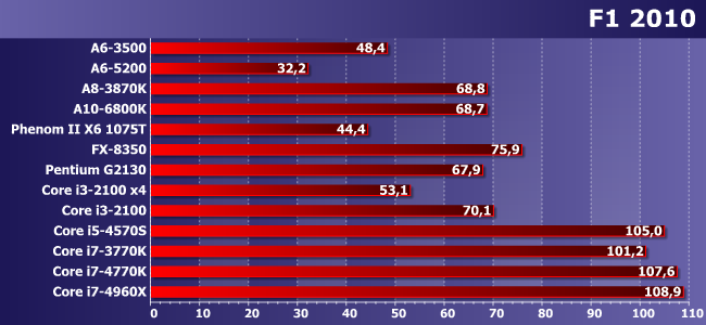 В общем, как видим, в наиболее «свежем» (из используемых нами на данный момент) графических движков определенный смысл в многоядерности есть, однако ее поддержка не столь уж прямолинейна, как могло бы показаться — медленный четырехъядерный (причем не обязательно самый медленный) процессор легко может отстать от быстрого двухъядерного. Но самое неприятное даже не это, а то, что и требования к видеокарте у современных игр тоже выше, чем у более старых. С этим, собственно, и связан почти одинаковый результат ведущей пятерки — более 60 FPS в среднем не выдает уже Radeon HD 7950. Медленных же процессоров действительно не хватает для того, чтобы видеокарта могла показать все, на что способна, но... Если отбросить совсем уж специфичные А6-3500/5200, даже A8-3870K (аналог которого без видеочасти Athlon II X4 651 появился еще пару лет назад и стоит куда дешевле сотни долларов) отстает от лидеров лишь на 20%, а более современный Pentium G2130 — вообще на 10%. Если же ориентироваться на более медленные и дешевые карты (что при использовании бюджетного процессора более привычно) разница будет еще меньшей. Вплоть до полного исчезновения.