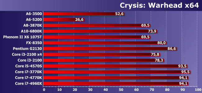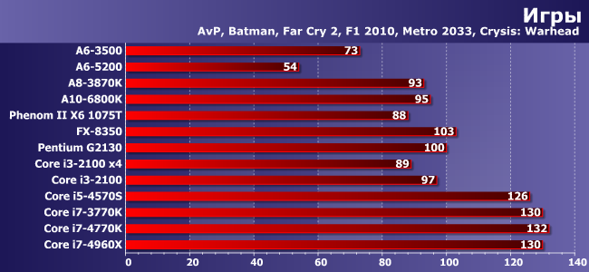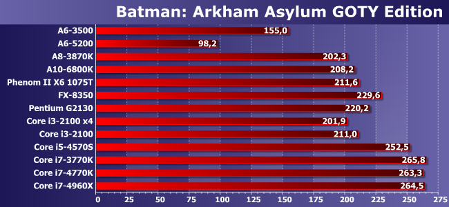 Нагрузка на процессор здесь не ниже, чем в предыдущем случае. Но, к сожалению, игра в принципе не умеет использовать более двух потоков вычислений (Batman иногда пытается, однако не всегда эффективно), в результате чего Pentium G2130 обогнал даже FX-8350, а на ноутбучном А6-5200 играть просто невозможно, фактически независимо от видеокарты. Впрочем, последний на этот «праздник жизни» попал совершенно случайно: на практике никто не будет, разумеется, устанавливать мощную видеокарту в систему с медленным экономичным процессором. Да и для владельца старенького (уже) А6-3500 последняя дороговата. Остальные же участники сравнимы друг с другом. Будь это недорогой APU (или еще более дешевый Athlon X4), Pentium или, напротив, топовый шестиядерный Core i7 — принципиальной разницы в таких играх не будет. Вот видеокарты вплоть до Radeon HD 7790 подходят для них плохо :)