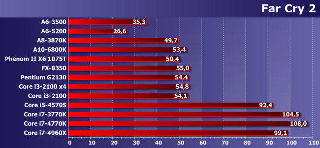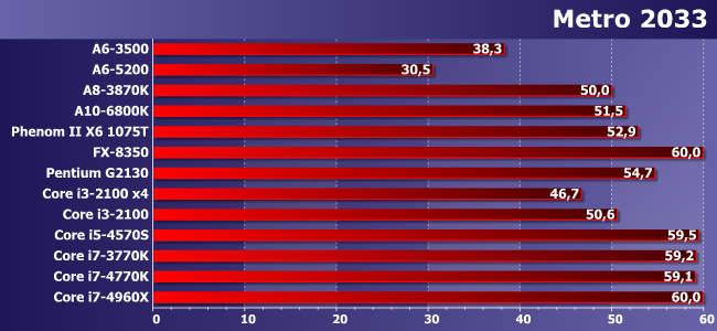 А вот пример «легкого» графического движка, где все определяется процессором. Фактически даже однопоточной производительностью последнего, со всеми вытекающими — Pentium G2130 обходит все процессоры AMD, за исключением FX-8350. Да и преимущество FX над Phenom или старшими сокетными APU (даже старыми — типа A8-3870K) крайне невелико. Равно как и превосходство старших Core над Pentium: у них больше кэш-памяти и выше максимальная тактовая частота при неполной нагрузке, да и все. Хотя иногда и этого достаточно, да и вообще — результирующая частота кадров такова, что качество можно увеличивать и дальше, что разброс значений только сократит.