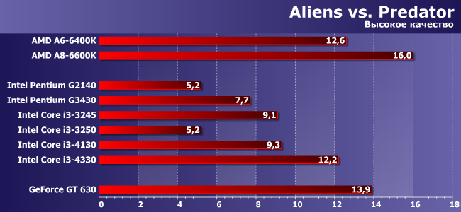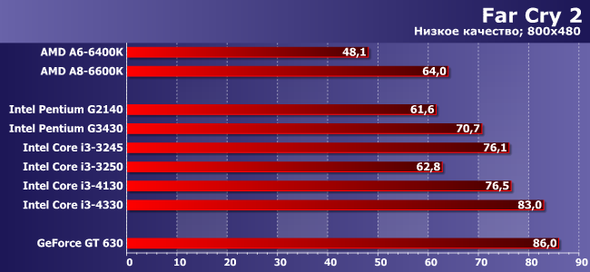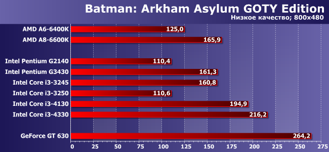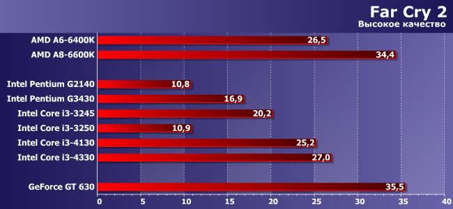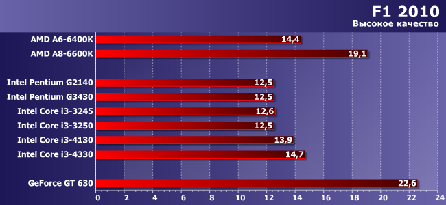 Качественный (в рамках наших тестирований) режим этой игры «сдался» интегрированной графике от Intel после появления HDG 4000, а более новые GPU компании, естественно, еще быстрее. И даже Pentium не хватило самую малость, чтоб дотянуть до 30 FPS. Достижение, которое, впрочем, меркнет на фоне того, что даже старый А4-5300 или совсем уж древний А6-3500 все равно быстрее — высокую планку задала AMD, ничего не скажешь. Собственно, нет ничего удивительного и в том, что APU этой компании уже и младшую дискретку с рынка вытесняют. А у Intel, несмотря на бурный прогресс, труба пониже и дым пожиже :) Впрочем, тоже уже понятно, что и в системы на ее новых процессорах ставить решения класса GT 630 (тем более ниже) уже не имеет смысла — принципиального прироста производительности не будет.