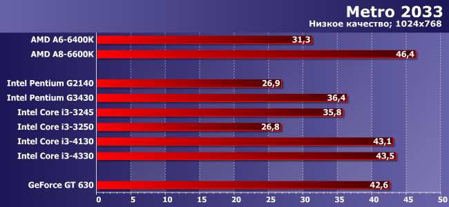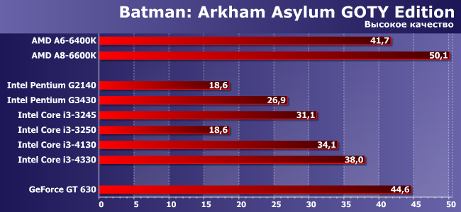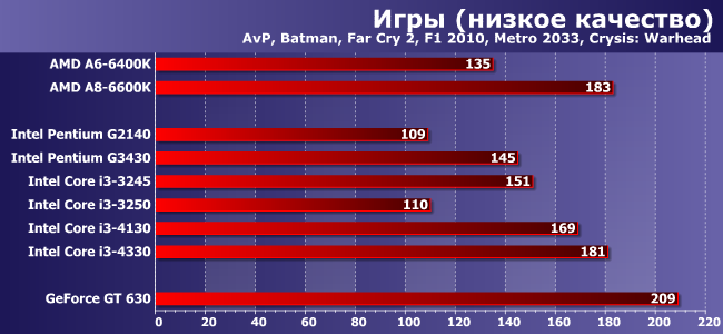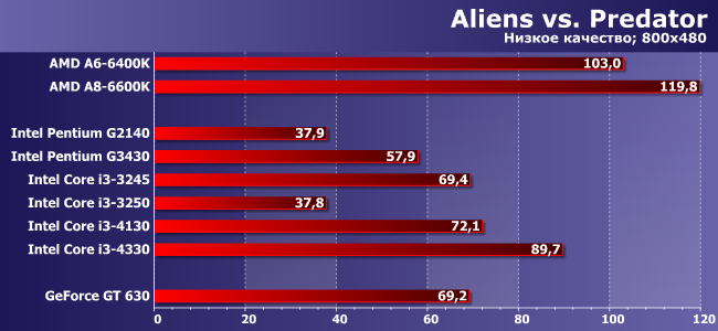 На минимуме, естественно, все летает. Кроме младшей графической конфигурации Ivy Bridge — даже в таком режиме ее еле хватало, чтобы перевалить за границу в 30 FPS. Так что радует, что у новой графики таких проблем хотя бы нет. И даже от дискретки уровня GT 630 уже отстает только Pentium и то немного, а устанавливать такие карты в компьютер на базе любого нового Core i3 точно дурная затея. Ну а APU впереди с большим отрывом от прочих. Результат не стал неожиданным, хотя надежды на хотя бы примерный паритет старших Core i3 с хотя бы намного более дешевыми А6. Видали мы некогда более низкие результаты даже у совсем старых А8, конечно, однако инженеры и программисты AMD тоже без дела не сидели последний год :)
