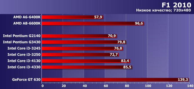 В легком режиме уже даже при слабой графике видны недостатки двухпоточных процессоров. Впрочем, в очередной раз заметнее всего это проявляется при использовании процессоров AMD, а вот у Intel разница между Pentium и Core i3 невелика (причем новый Pentium может и обогнать старый i3). Поэтому минимумом стоит считать что-нибудь класса А8. Либо покупать дискретную видеокарту — специфика движков EGO (используемых во всей серии Formula One) такова, что даже снижение качества графики не делает ее бесполезной.
