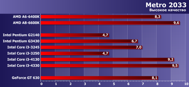 При низком качестве картинки и старом графическом движке получается уже по большей части сравнение процессоров. С небольшими вариациями: все-таки HDG 2500 (и его родственники бюджетных семейств) слишком слабое решение, а использование дискретки меньше мешает процессорной составляющей работать в полную силу. Но в общем и целом в таком режиме можно было играть даже на Celeron G555, а прогресс со времен его появления позволяет уже так сильно себя не ограничивать.