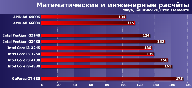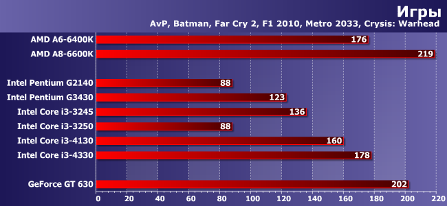 Core i3 на первый взгляд «подросли» слабее — HDG 4400 быстрее, чем HDG 4000 лишь на 20%, а не в полтора раза. Что легко объяснимо — если в бюджетном сегменте количество конвееров увеличилось с 6 до 10, то «этажом выше» только с 16 до 20. Однако не стоит забывать, что 4000 в предыдущем поколении являлось топовым GPU, причем применяющимся лишь в небольшой части настольных процессоров, а 4400 — нижний уровень новых настольных Core: в большинстве уже используется HDG 4600, имеющий чуть более высокую производительность. Фактически даже можно говорить о переходе количества в качество — всего-то год назад только HDG 4000 (тот самый — редкий вариант) мог обеспечить в играх частоту кадров на уровне APU AMD линейки A4, а вот сейчас уже образовался паритет и с более быстрыми А6. Естественно, на победу это никак не похоже — все-таки по цене даже А8 держатся на уровне Pentium, а Core i3 — более быстрые, но и заметно более дорогие процессоры, однако факт постепенно выравнивания позиций имеет место быть. Впрочем, выход APU на базе Kaveri вполне возможно сумеет восстановить статус-кво, однако массового распространения этих устройств (и их продвижения в нижние сегменты ассортимента AMD) придется еще подождать. А замена Trinity на Richland, как мы уже писали, являлась лишь косметическим обновлением. Совсем не похожим на переход с Ivy Bridge на Haswell.