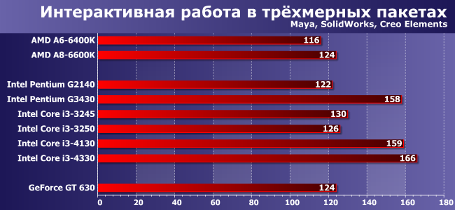 Как мы уже писали, в драйвере версии 9.18.10.3257 программисты Intel исправили очередную порцию ошибок, что привело к любопытному эффекту: даже Pentium на Ivy Bridge (прибавив 20% к прошлогодним результатам) уже выходит на уровень любых APU AMD (за исключением, может быть, Kaveri, но эти модели только-только начинают поступать в торговые сети). Более того — это уровень младших игровых дискретных чипов NVIDIA, даже работающих в паре с более быстрым процессором. В общем, больше не стоит бояться интегрированной графики Intel. Особенно после выхода Haswell — это еще более высокий уровень производительности. Причем, как видим, установка младшей игровой дискретки (что было для таких программ практически обязательным во времена Sandy Bridge) производительность заметно снижает, т. е. этого лучше уже не делать.