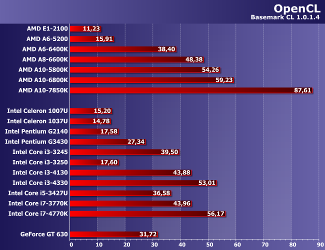 На диаграмме мы собрали результаты всех протестированных в данной программе процессоров, что нарисовало крайне любопытную картину. Во-первых, как видим, HDG 2500 или «безномерной» родственник данного GPU обеспечивают производительность лишь на уровне младших мобильных решений. Понятно почему — код хорошо параллелится, так что шесть конвееров это шесть конвееров, хоть в CULV Celeron, хоть в настольном Core i3. А вот Pentium на Haswell уже намного быстрее. Впрочем, рассматривать его как серьезный OpenCL-ускоритель все равно не получается: на до A6, ни до процессоров с HDG 4000 (опять же — неважно: мобильных или настольных) он все равно никак не дотягивается. Но определенные преференции при использовании OpenCL можно получить и с его помощью — хотя бы большие, чем получит покупатель любых процессоров на ядре AMD Kabini. А вот HDG 4400 — куда более привлекательный вариант: как видим, всего лишь Core i3 нового поколения оказался равен топовому Core i7 предыдущего! Да и сравнительно с конкурирующими продуктами это не так и плохо — уровень некоторых А8. Понятно, что они дешевле, но разница в цене с младшими Core i3 все ж таки много меньше, нежели со старшими Core i7 :) А HDG 4600 это уже уровень А10. Причем несложно заметить, что большие бенефиции от внедрения OpenCL могут получить все экономные покупатели, а не только те, кто выбирает продукцию AMD: разница между i3 и i7 менее 10%. В общем, победные реляции портят только результаты Kaveri — AMD удалось в очередной раз прыгнуть выше головы. Но мало этих APU пока, в отличие от лежащих на каждом углу Core i3. К тому же, более дешевых и более производительных на классическом х86-коде, что при текущем положении дел с внедрением OpenCL крайне важно (процессор, который в большем количестве программ быстрее, а в небольшом — медленнее, выглядит привлекательнее того, который побеждает лишь в экзотическом специально подобранном окружении).