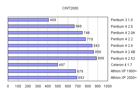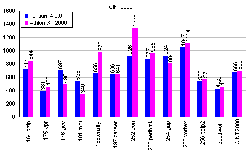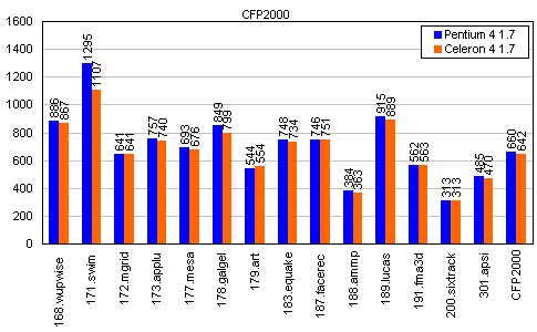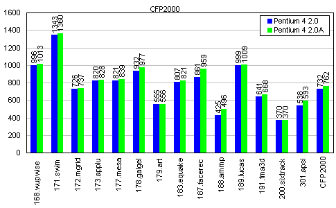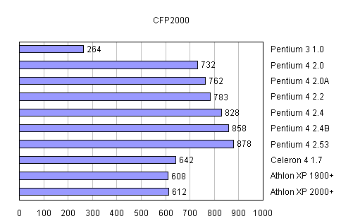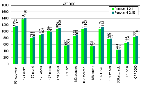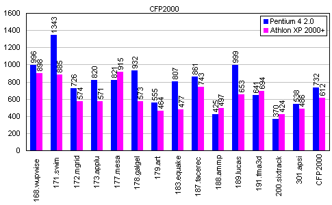 В десяти приложениях из набора CFP2000 лидирует Pentium 4. Наиболее выдающийся тест — 183.equake, Intel выигрывает в нем 40,9%. В остальных четырех задачах впереди Athlon XP (максимально на 16,7% в тесте 188.ammp). Отставание процессора компании AMD составляет 16,4% по интегральной оценке.