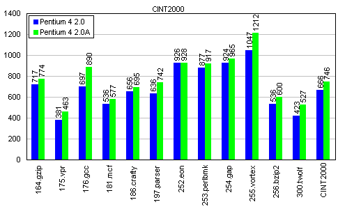 На следующей паре диаграмм мы увидим, как реагирует тест SPEC CPU2000 на возросший до 512KB кэш ядра Northwood.