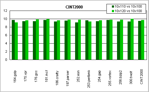 Приложения, демонстрирующие высокую зависимость от частоты процессора, показывают низкую чувствительность к скорости памяти и наоборот. Отрицательные результаты для 164.gzip и 252.eon могут быть объяснены неточностью тактового генератора. Например, если 100 — это на самом деле 99.5, а 110 — это 110.5, то тактовая частота процессора в варианте 10x110 на самом деле на 1% меньше, чем в случае 11x100.
