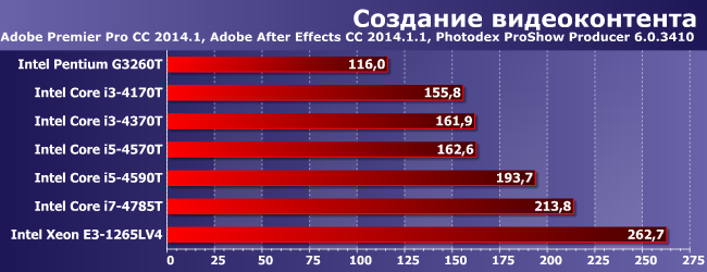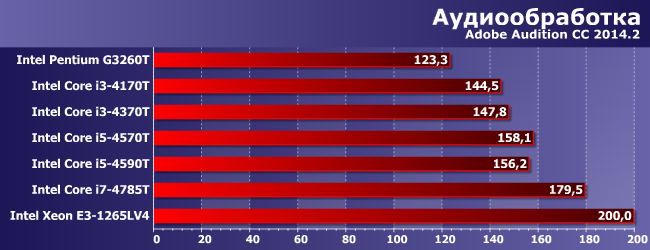 Audition не слишком восприимчив к потокам «традиционного» кода, но умеет кое-что перекладывать на GPU. В общем-то, не тот случай, когда слишком уж оправданы процессоры выше Core i3, но E3-1265LV4 (где просуммированы оба вышеупомянутых эффекта) от них хоть немного, да оторвался.