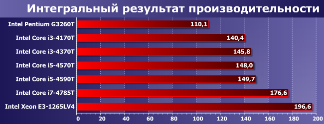 Очевидный аутсайдер Pentium, поскольку у него и GPU слабый, и ядер мало, и поддержка расширенного набора SIMD-инструкций ограниченная. У прочих дела обстоят получше, но вот тут уже разница между двух- и четырехъядерными Core одного поколения невелика. Хотя, конечно, с какой стороны посмотреть — все-таки у i5-4590T и выше даже максимальные частоты в режиме Turbo Boost невелики, а старшим двухъядерникам они как минимум не проигрывают. Но выиграть весомо в очередной раз может только Broadwell.