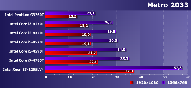 GT1 (т.е. графики Pentium и Celeron) просто мало, GT2 уже хватает на HD-разрешение (кстати, обратите внимание на то, как в данном случае различаются 4570Т и 4590Т, хотя GPU у них формально одинаковый), ну а GT3e в Xeon на Broadwell позволяет играть и при нормальном разрешении, да и для повышения качества картинки небольшой запас есть.