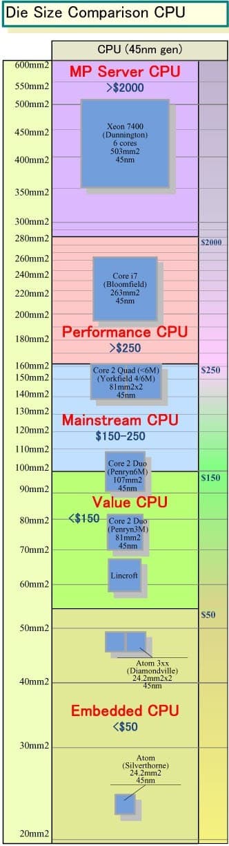 Проведя необходимую теоретическую подготовку, мы наконец-то дошли до собственно архитектуры. Её сильное упрощение позволило сократить число транзисторов в ЦП до 47 млн. (из них на ядро, включая оба кэша L1 — 13,8 млн.), а площадь — до 26 мм² (используется 45-нанометровый техпроцесс с 9 слоями медных дорожек, металлическими затворами и подзатворными диэлектриками с высокой проницаемостью). Для сравнения — 90-нанометровые Pentium М занимали 84 мм², но там вчетверо больший кэш L2. Ядро Pentium М занимает примерно 35 млн. транзисторов, а Core 2 — 50 млн. Хотя, конечно, сравнения с первым Pentium (3,3 млн.) Атом не выдерживает — совсем уж простым его назвать тоже нельзя, что косвенно видно по размеру статьи. :)