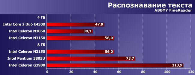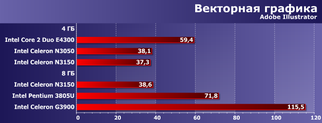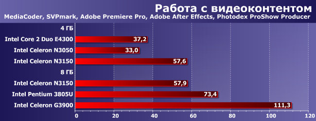 Впрочем, «поиграться» нам удалось лишь с компактной системой, так что тестировать пришлось с GPU, интегрированным в чипсет Intel 946GZ (а вспоминая возможности графики Intel тех лет, понятно, что хоть какая-то «затычка» при желании продолжать полноценно пользоваться компьютером — уже не роскошь) и 4 ГБ памяти типа DDR2. C другой стороны, имеющийся под рукой компьютер на Celeron N3050 снабжен лишь одним слотом SO-DIMM, так что и в него проще всего было установить те же 4 ГБ. А вот Pentium 3805U (интересный тем, что имеет практически равную нашему герою тактовую частоту и аналогичную емкость кэш-памяти) и Celeron G3900 (тоже сходный по организации, но не частоте — зато самый медленный настольный процессор для современной платформы) мы тестировали в «стандартных» для основной серии статей условиях — с 8 ГБ памяти. Равно как и Celeron N3150, защищающий цвета четырехъядерных бюджетных Atom. В итоге решили для удобства сравнения (и максимальной корректности) протестировать его еще раз — оставив один модуль DDR3 на 4 ГБ, благо и «канальность» памяти для этих процессоров не так уж важна. Заодно, кстати, и оценим, насколько (и где) процессорам такого уровня производительности могут пригодиться 8 ГБ памяти.