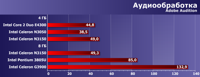 Эти программы вообще недолюбливают процесоры Atom со всеми вытекающими, а часть из них не слишком требовательна к количеству вычислительных ядер, но Celeron N3150 все равно быстрее Core 2 Duo E4300. Но не слишком — в отличие от нынешних Core, где сохраняет все тоже соотношение производительности: вдвое больше на каждый мегагерц. А если учесть, что и у ноутбучных процессоров тактовые частоты уже повыше, не говоря уже о настольных — итог предсказуем.