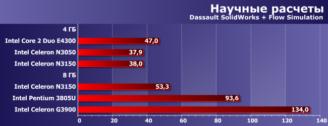 Этот тест мы запускали в первую очередь из хулиганских побуждений — понятно, что использующие на практике подобные расчеты давно уже выполняют их на совсем других системах. Однако полезные результаты получить все равно удалось — здесь (и, практически, только здесь) 4 ГБ памяти катастрофически мало. Настолько мало, что четыре «атомных» ядра в итоге оказались практически не быстрее двух. C другой стороны, очень может быть, что это и тот редкий случай, когда даже «атомным» ядрам (когда их четыре) может не хватить пропускной способности одного канала DDR3-1600. Но два ядра в стареньком Core2 все-таки быстрее: несмотря на те же 4 ГБ памяти, причем и с немного меньшей пропускной способностью. Правда вот даже с поправкой на потенциальный прирост от увеличения объема памяти (что не так-то просто — иначе бы мы это, конечно, сделали) очевидно, что и в этом случае даже бюджетные современные процессоры куда быстрее не самых бюджетных исторических. В целом соотношение производительности так или иначе, но похоже на предыдущие тесты.