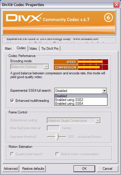 Как видите, в настройках кодека DivX 6.7 появилась новая опция Experimental SSE4 full search. Вообще-то, если уж по-честному, то использование разработчиками ПО эвфемизма «Experimental» знающим людям само по себе говорит многое. В переводе с технического на русский, это, как правило, звучит примерно так: «Мы тут чего-то напрограммировали, впечатлённые новыми возможностями — но всерьёз это даже сами пока не воспринимаем».