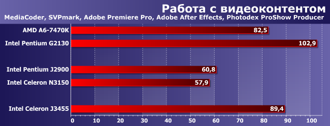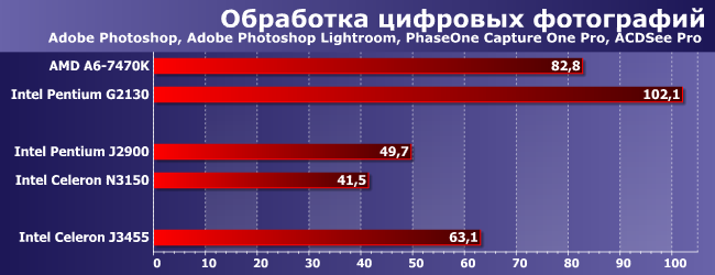 Эти приложения еще хуже относятся к представителям «атомных» платформ, да и хорошей утилизацией многопоточности не все из них похвастаться могут — соответственно, «настольные» процессоры (даже бюджетные и/или устаревшие) выглядят еще лучше, чем в предыдущем случае. Однако прирост производительности в своей нише тоже хорошо заметен: треть сравнительно с J2900 или полтора раза на фоне N3150. Тестируя топовые решения Intel мы такого давно не видели — но там и «расти» сложно. А вот «атомы», как видим, ускорять еще есть куда.