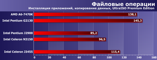 Старый код, как не раз уже было сказано, плохо относится к интенсивным методам повышения производительности, но неплохо реагирует на экстенсивные: количество ядер, их частоту и т. п. Несмотря на это J3455 сумел хоть на 15%, но обогнать J2900, а ведь ему это было и не обязательно: все-таки (если сравнить две платформы) позиционируется он на уровне J1900, который был еще медленнее.