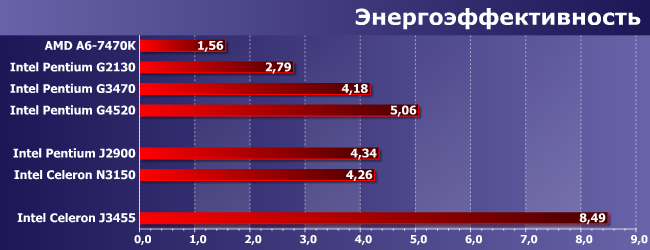 Что касается собственно энергопотребления, то оно, как видим, у Apollo Lake заметно уменьшилось по сравнению с Bay Trail и даже Braswell (Braswell в этом плане нас несколько разочаровал, но Apollo Lake первое впечатление от 14 нм исправил), которые на фоне настольных процессоров и без того смотрелись неплохо. Теперь стало еще лучше: полная связка из SoC, платы и памяти уже укладывается в среднем в 9 Вт, да и минимальное энергопотребление (не в простое, а в ходе выполнения вполне осмысленных задач) сократилось еще радикальнее. В общем, в плане «абсолютной экономичности» тоже прогресс. И производительность выше. А как это сказывается на «энергоэффективности»?