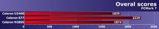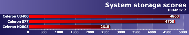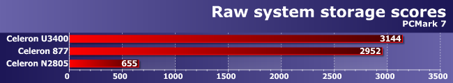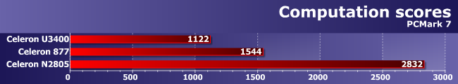 Вот что поразило в ином смысле, так это трасса Computation, которая как раз от дисковой системы не зависит. Что Celeron 877 быстрее U3400 пропорционально тактовой частоте, понятно — как мы уже не раз убеждались, эффективность низкочастотных Sandy Bridge и Arrandale сравнима (это на высоких частотах более новое семейство легко выходит вперед). А откуда такой сокрушительный успех Bay Trail? Вспоминаем описание трассы: The Computation test measures CPU and GPU computation performance without being unduly influenced by the system memory, chipset or storage devices. Теперь учитываем, что возможность использования встроенного GPU для вычислений появилась начиная с третьего поколения Intel HD Graphics, т.е. со времен Ivy Bridge. Но аналогичное используется и в Haswell, и в Bay Trail, что и позволяет добиться последнему столь высоких результатов. Правда видели мы и лучшее — Celeron 1007U недавно обошел Celeron 847 на OpenCL-коде почти в семь раз. Но не стоит забывать и о том, что у N2805 конвееров четыре, а не шесть, да и тактовая частота GPU сильно снижена, дабы уложиться в жесткие рамки TDP, так что и так неплохо: в удачных условиях новый процессор может обгонять предшественников в разы. Но в удачных и не непосредственных предшественников :)