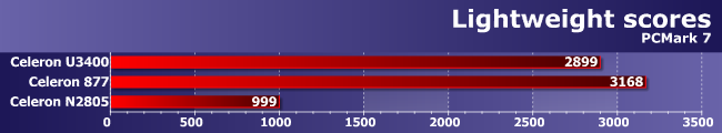 Что имеем в сухом остатке? PCMark — тест системы, что неоднократно подчеркивалось разработчиком пакета. Кроме того, седьмая его версия является очень «дискозависимой» — эти трассы встречаются почти во всех группах тестов. Таким образом, новая платформа в неудачном окружении легко может проиграть старым в ряде случаев в два-три раза. Но может и существенно выиграть, когда основная нагрузка ложится на процессор и/или GPU. В общем и целом видим уровень Arrandale. Почти уровень Arrandale — тактовая частота U3400 ниже как минимум на четверть. Равночастотный Sandy Bridge уже заметно быстрее, но ведь это тоже уже устаревшая (пусть и до сих пор продаваемая) платформа — есть шустрые CULV-модели на ядре Ivy Bridge, да и Haswell начинает распространяться в данном сегменте. Естественно, рассчитывать на аналогичный уровень производительности не приходится даже в тех случаях, когда процессору удается обеспечить «скоростное» окружение, и тут у Bay Trail остается только одно преимущество — низкое энергопотребление. А вот со старыми Celeron его уже как-то можно ставить рядом и по производительности.