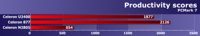 Как видим, с точки зрения домашнего или рабочего компьютера... Celeron четырехлетней давности новые модели с таким названием догнать не могут :) Но эффективность на гигагерц частоты явно выросла — вспоминаем, что в офисном ПО Celeron U3400 обгонял Atom D2700 на 20%. N2805 отстает уже на 15% (часть из которых все равно можно списать на окружение), но его тактовая частота в полтора раза ниже, чем у D2700. Причем, как уже было сказано выше, это самая младшая модель новой линейки — даже не менее ограниченный по большинству фронтов N2806 умеет в турбо-режиме увеличивать частоту до тех самых 2 ГГц, тем не менее укладываясь в не менее жесткий теплопакет. И этот теплопакет даже ниже, чем у нетбучных Atom предыдущего поколения, что в мобильном окружении может оказаться весьма важным.