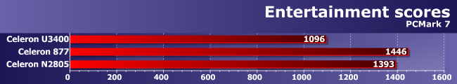 Вот где он неплохо выглядит, так это в области развлечений. И ничего удивительного — здесь уже сказывается GPU, который в этом поколении процессоров не имеет проблем с декодированием видео, да и в простых играх «что-то может». Но это большой шаг для архитектуры Atom, который все еще не позволяет полноценно сравнивать ее с Core — позади только Celeron U3400. А ведь он когда-то был шагом назад, если сравнивать со связкой Celeron SU2300+Ion, например, т.е. фактически новые Celeron на Bay Trail в таких задачах — это шаг назад не на три года (во времена Sandy Bridge), а, можно сказать, на все пять лет.